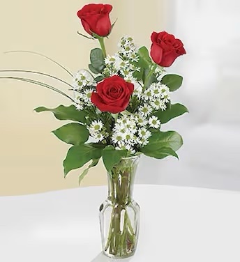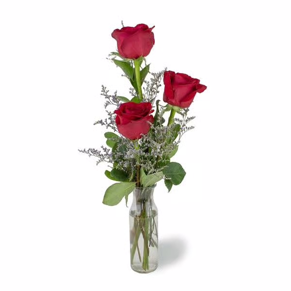 3 roses in a bud vase with filler flowers. Free delivery with in 30 miles of Red Wing, if you place your order before February 9! Put delivery address, recipient card information (a special message) and day you want delivery in the notes!!